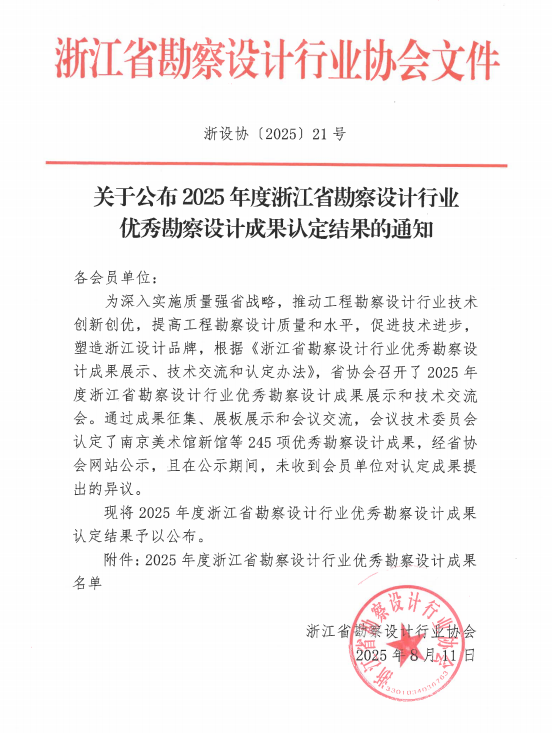 162025-06 匠心筑安瀾!我院兩項工程設(shè)計榮膺2025年寧波市優(yōu)秀勘察設(shè)計獎 匠心筑安瀾!我院兩項工程設(shè)計榮膺2025年寧波市優(yōu)秀勘察設(shè)計獎 發(fā)布日期:2025.06.16 近日,2025年度寧波市優(yōu)秀勘察設(shè)計獎評選結(jié)果正式揭曉。我院精心打造的奉化江堤防整治工程鄞奉交界段憑借卓越設(shè)計一舉奪得水利工程設(shè)計一等獎,寧??h西林水庫擴容... 發(fā)布日期:2025.06.16 近日,2025年度寧波市優(yōu)秀勘察設(shè)計獎評選結(jié)果正式揭曉。我院精心打造的奉化江堤防整治工程鄞奉交界段憑借卓越設(shè)計一舉奪得水利工程設(shè)計一等獎,寧??h西林水庫擴容...