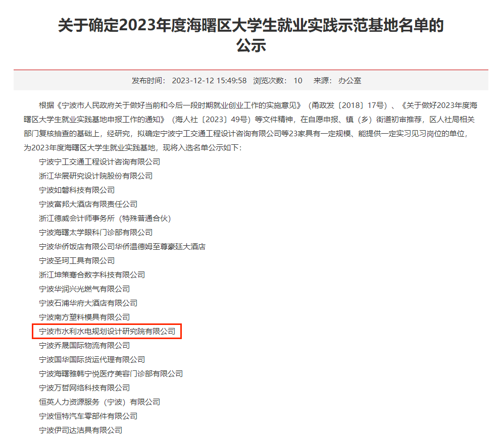 212023-12 喜報(bào) | 我院獲評2023年度海曙區(qū)大學(xué)生就業(yè)實(shí)踐示范基地 喜報(bào) | 我院獲評2023年度海曙區(qū)大學(xué)生就業(yè)實(shí)踐示范基地 發(fā)布日期:2023.12.21 近日,根據(jù)《寧波市人民政府關(guān)于做好當(dāng)前和今后一段時期就業(yè)創(chuàng)業(yè)工作的實(shí)施意見》(甬政發(fā)〔2018〕17號)、《關(guān)于做好2023年度海曙區(qū)大學(xué)生就業(yè)實(shí)踐基地申報(bào)工作的通知》(海人社〔2023〕... 發(fā)布日期:2023.12.21 近日,根據(jù)《寧波市人民政府關(guān)于做好當(dāng)前和今后一段時期就業(yè)創(chuàng)業(yè)工作的實(shí)施意見》(甬政發(fā)〔2018〕17號)、《關(guān)于做好2023年度海曙區(qū)大學(xué)生就業(yè)實(shí)踐基地申報(bào)工作的通知》(海人社〔2023〕...