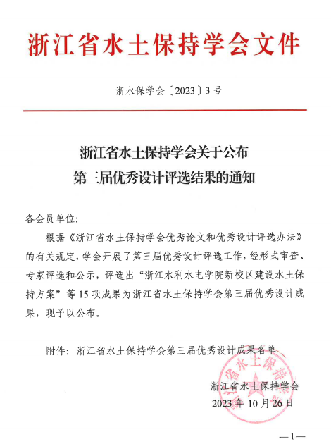 212023-12 喜報(bào) | 我院項(xiàng)目榮獲浙江省水土保持優(yōu)秀設(shè)計(jì) 喜報(bào) | 我院項(xiàng)目榮獲浙江省水土保持優(yōu)秀設(shè)計(jì) 發(fā)布日期:2023.12.21 近日,浙江省水土保持學(xué)會第三屆優(yōu)秀設(shè)計(jì)評選獲獎名單出爐,15個獲獎工程中,我院成功鎖定一席!此次我院受寧??h水利局委托開展實(shí)施的寧海縣飲用水源地上游香榧經(jīng)濟(jì)林水土流失防治措... 發(fā)布日期:2023.12.21 近日,浙江省水土保持學(xué)會第三屆優(yōu)秀設(shè)計(jì)評選獲獎名單出爐,15個獲獎工程中,我院成功鎖定一席!此次我院受寧??h水利局委托開展實(shí)施的寧海縣飲用水源地上游香榧經(jīng)濟(jì)林水土流失防治措...