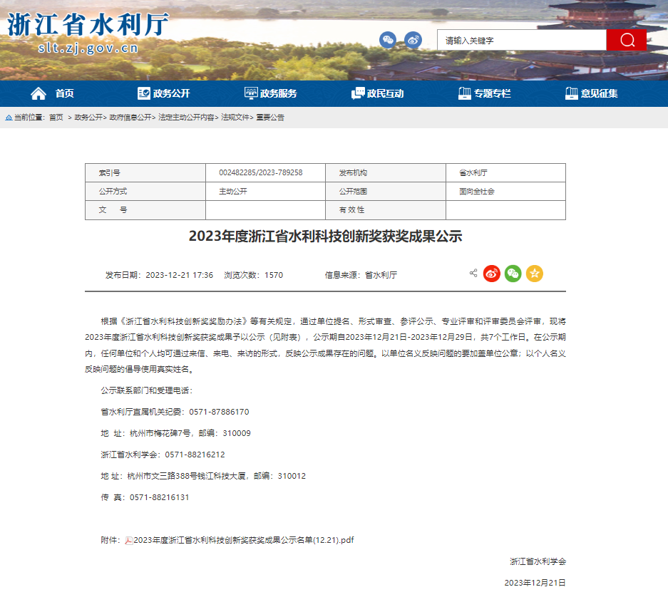 042024-01 喜報(bào) | 我院3項(xiàng)成果榮獲2023年度浙江省水利科技創(chuàng)新獎! 喜報(bào) | 我院3項(xiàng)成果榮獲2023年度浙江省水利科技創(chuàng)新獎! 發(fā)布日期:2024.01.04 近日,浙江省水利廳公布2023年度浙江省水利科技創(chuàng)新獎獲獎名單,寧波市水利院申報(bào)的3項(xiàng)成果順利通過公示,榮獲浙江省水利科技創(chuàng)新獎三等獎! ? 此次我院共計(jì)申報(bào)成果3項(xiàng),... 發(fā)布日期:2024.01.04 近日,浙江省水利廳公布2023年度浙江省水利科技創(chuàng)新獎獲獎名單,寧波市水利院申報(bào)的3項(xiàng)成果順利通過公示,榮獲浙江省水利科技創(chuàng)新獎三等獎! ? 此次我院共計(jì)申報(bào)成果3項(xiàng),...