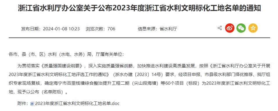 152024-01 喜報(bào) | 我院全過程工程咨詢項(xiàng)目獲評“浙江省文明標(biāo)化工地” 喜報(bào) | 我院全過程工程咨詢項(xiàng)目獲評“浙江省文明標(biāo)化工地” 發(fā)布日期:2024.01.15 近日,經(jīng)浙江省水利廳2023年度浙江省水利文明標(biāo)化工地名單公布,我院承擔(dān)全過程工程咨詢的寧波市江北區(qū)小西壩泵站工程喜獲“浙江省文明標(biāo)化工地”稱號,成為寧波市水利行業(yè)的標(biāo)桿... 發(fā)布日期:2024.01.15 近日,經(jīng)浙江省水利廳2023年度浙江省水利文明標(biāo)化工地名單公布,我院承擔(dān)全過程工程咨詢的寧波市江北區(qū)小西壩泵站工程喜獲“浙江省文明標(biāo)化工地”稱號,成為寧波市水利行業(yè)的標(biāo)桿...