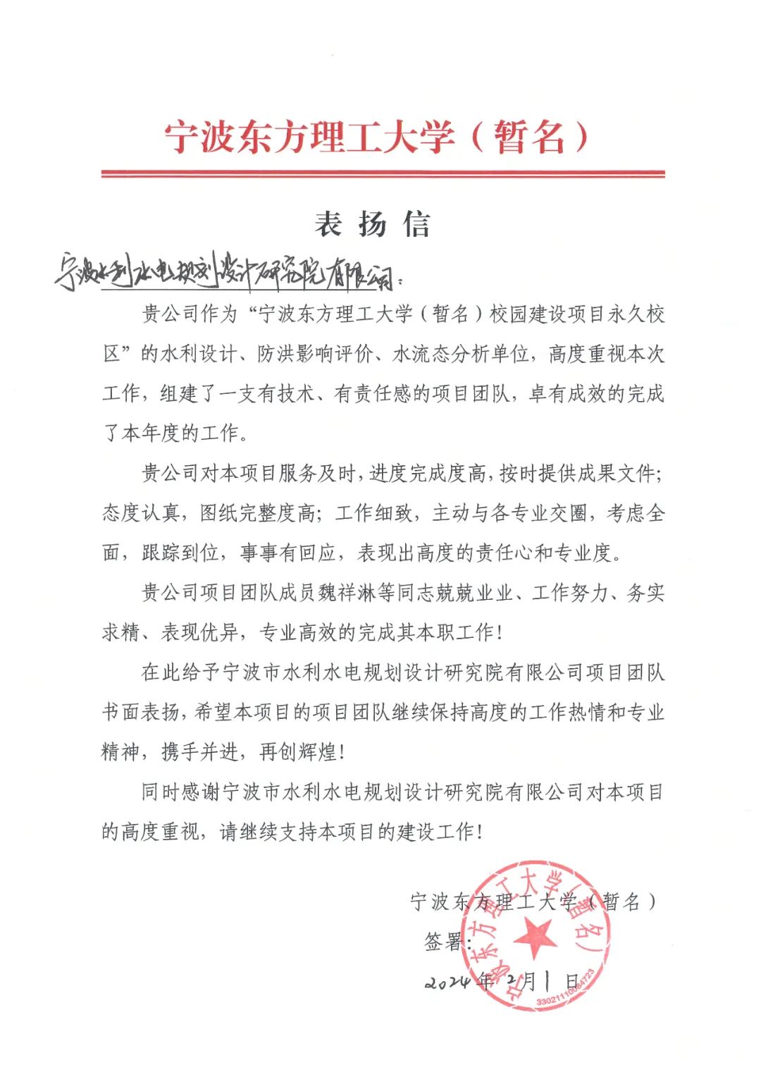 072024-02 一封感謝信 點(diǎn)贊工匠精神—— 寧波市水利院收到來自寧波東方理工大學(xué)的感謝信 一封感謝信 點(diǎn)贊工匠精神—— 寧波市水利院收到來自寧波東方理工大學(xué)的感謝信 發(fā)布日期:2024.02.07 辭舊迎新之際,寧波市水利院收到寧波東方理工大學(xué)的感謝信。信中提到,我院在寧波東方理工大學(xué)(暫名)校園永久校區(qū)建設(shè)項(xiàng)目中,派出的項(xiàng)目團(tuán)隊(duì)高效、專業(yè)、及時地做好技術(shù)支撐服務(wù)工... 發(fā)布日期:2024.02.07 辭舊迎新之際,寧波市水利院收到寧波東方理工大學(xué)的感謝信。信中提到,我院在寧波東方理工大學(xué)(暫名)校園永久校區(qū)建設(shè)項(xiàng)目中,派出的項(xiàng)目團(tuán)隊(duì)高效、專業(yè)、及時地做好技術(shù)支撐服務(wù)工...