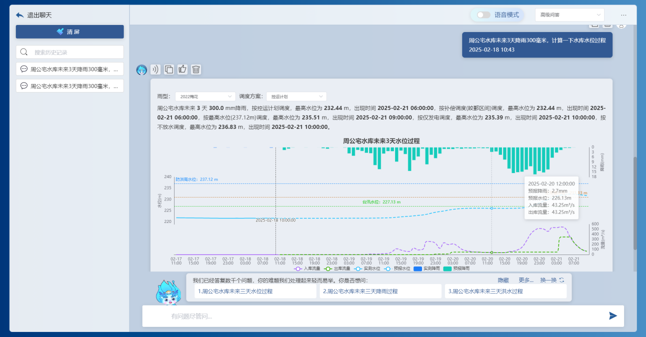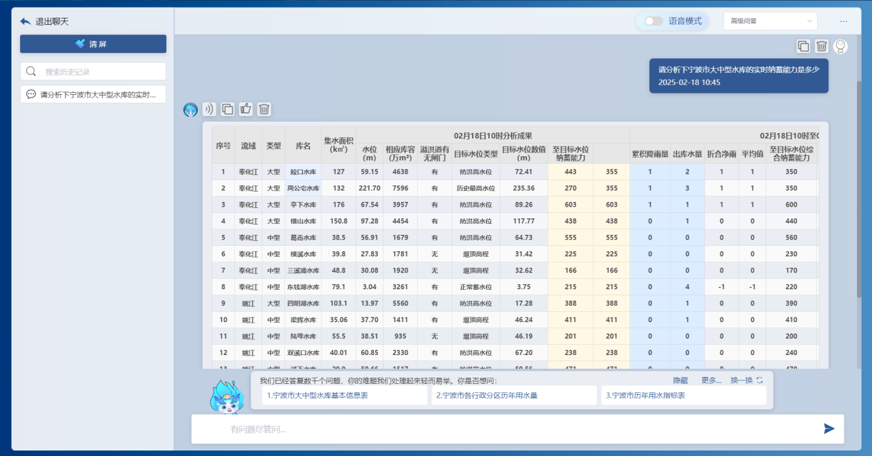 基于前端感知的降雨、水位、流量、工程運(yùn)行等實(shí)時(shí)信息,借助DeepSeek大模型和“甬水院智算”算法庫,能夠?qū)崟r(shí)對(duì)流域防汛形勢進(jìn)行快速分析,包括降雨形勢、水情預(yù)警、預(yù)泄分析、水庫納蓄分析等,可以按照規(guī)定的表單形式一鍵輸出成果,為防汛防洪工作提供兼具前瞻性、科學(xué)性、精準(zhǔn)性、安全性的決策支撐。相關(guān)學(xué)術(shù)成果曾以《基于大模型的水利防汛智能問答關(guān)鍵技術(shù)研究與應(yīng)用探索》為題于去年8月的第七屆城市水安全與水管理學(xué)術(shù)交流會(huì)作專題匯報(bào)。