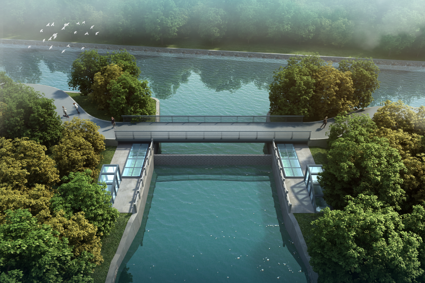 工程規(guī)模:新建洋市中心河閘站1座,泵站引水規(guī)模6.67m3/s,排澇規(guī)模20m3/s,閘寬12m;洋市中心河北閘采用鋼壩型式,閘寬22m;李馮河閘采用景觀溢流堰型式,閘寬8m。