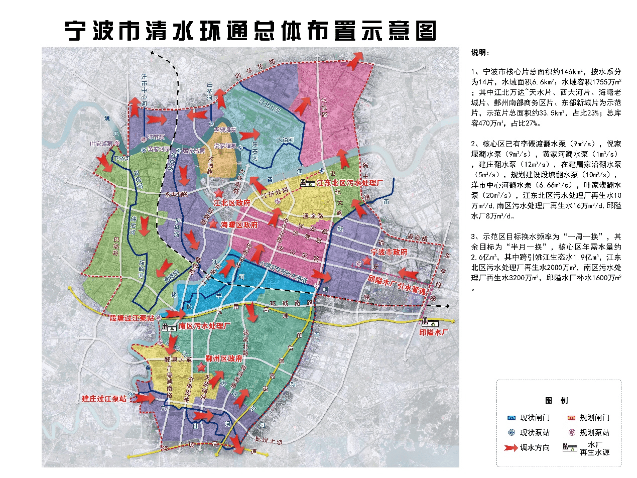 本工程任務(wù)為通過生態(tài)引調(diào)水,讓平原河網(wǎng)的水體活起來、動起來,改善河道水環(huán)境。工程位于寧波市區(qū),主要包括引排水泵站及凈化工程、中環(huán)通分區(qū)調(diào)控工程(結(jié)合排澇節(jié)制閘)、小環(huán)通及微循環(huán)分區(qū)調(diào)控工程(調(diào)水節(jié)制閘)、水系連通工程及其他工程等五部分。