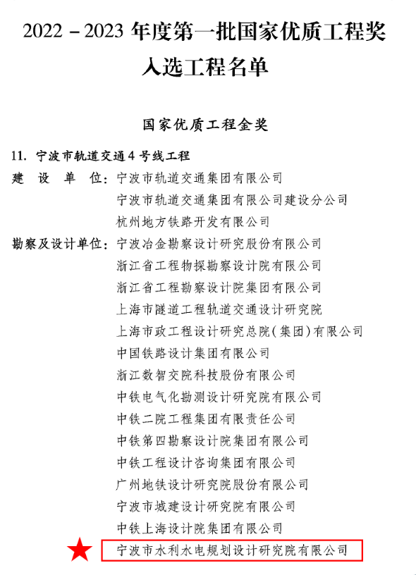 喜訊!我院參與設(shè)計(jì)的寧波軌道交通4號(hào)線工程榮獲國家優(yōu)質(zhì)工程金獎(jiǎng)
