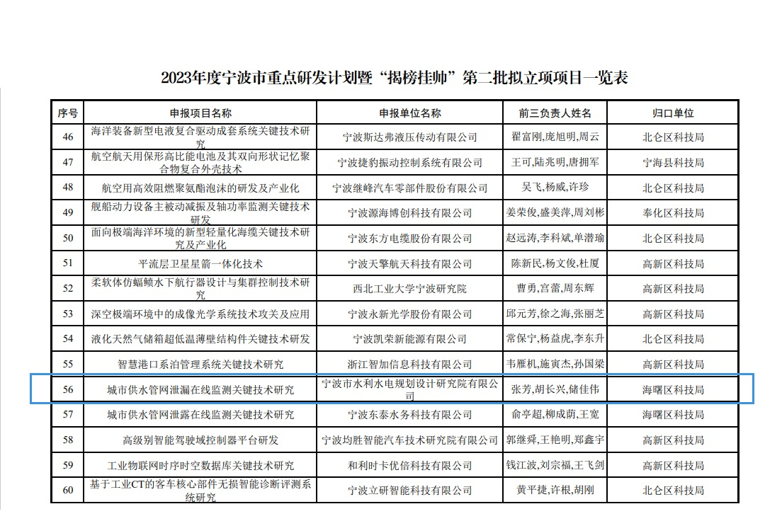 此前,我院“城市供水管網(wǎng)泄漏在線監(jiān)測關鍵技術研究”已入選寧波市重點研發(fā)計劃暨“揭榜掛帥”第二批擬立項項目。兩個項目合同總經(jīng)費達4000萬元。