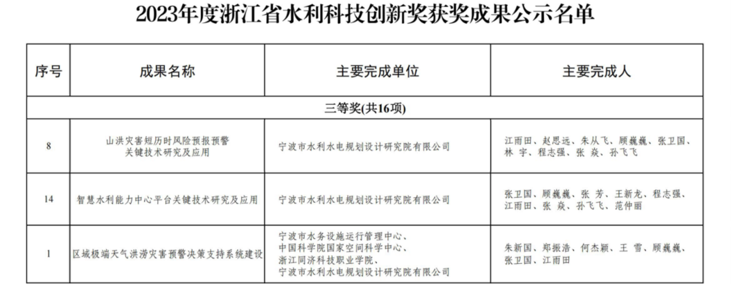 近日,浙江省水利廳公布2023年度浙江省水利科技創(chuàng)新獎(jiǎng)獲獎(jiǎng)名單,寧波市水利院申報(bào)的3項(xiàng)成果順利通過公示,榮獲浙江省水利科技創(chuàng)新獎(jiǎng)三等獎(jiǎng)!