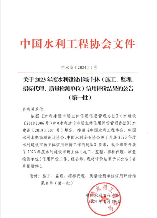 近日,中國水利工程協(xié)會《關(guān)于2023年度水利建設(shè)市場主體(施工、監(jiān)理、招標(biāo)代理、質(zhì)量檢測單位)信用評價結(jié)果的公告(第一批)》(中水協(xié)〔2024〕6號)、中國水利水電勘測設(shè)計協(xié)會《關(guān)于2023年度水利建設(shè)市場主體(勘察、設(shè)計、咨詢單位)信用評價結(jié)果的公告》(中水協(xié)秘〔2024〕6號)、《關(guān)于2023年度全國水利水電勘測設(shè)計行業(yè)信用評價結(jié)果的公告》(中水協(xié)秘〔2024〕7號)發(fā)布。